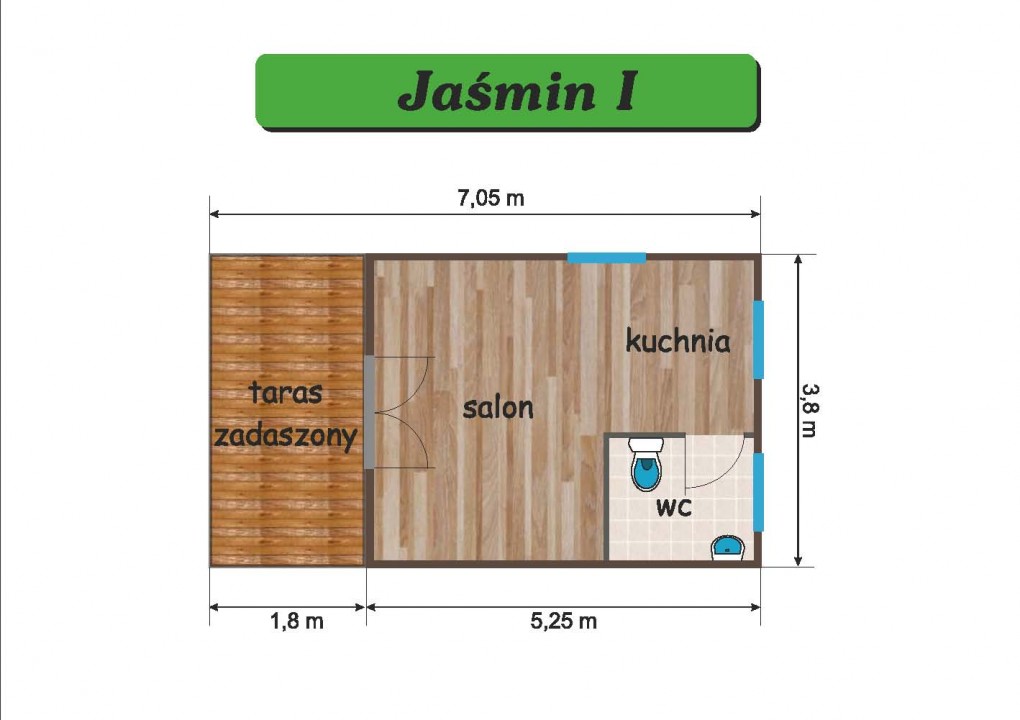 Oferowany domek to "JAŚMIN I" z zadaszonym tarasem" 25m2. o wymiarach 3.8m szerokości i 5m długości + taras zadaszony 3.8m x 1.8m. Domek może występować jako domek letniskowy lub całoroczny. Domek można wydłużać o kolejne segmenty po 100cm. Istnieje możliwość zamówienia domku z antresolą sypialną , która znajduje się nad kuchnią i łazienką.